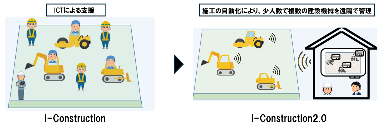 「i-Construction2.0」は従来の「i-Construction」をさらに発展・深化させた段階であり、より生産性の高い建設現場の実現に向け、建設現場のオートメーション化に取り組みます。