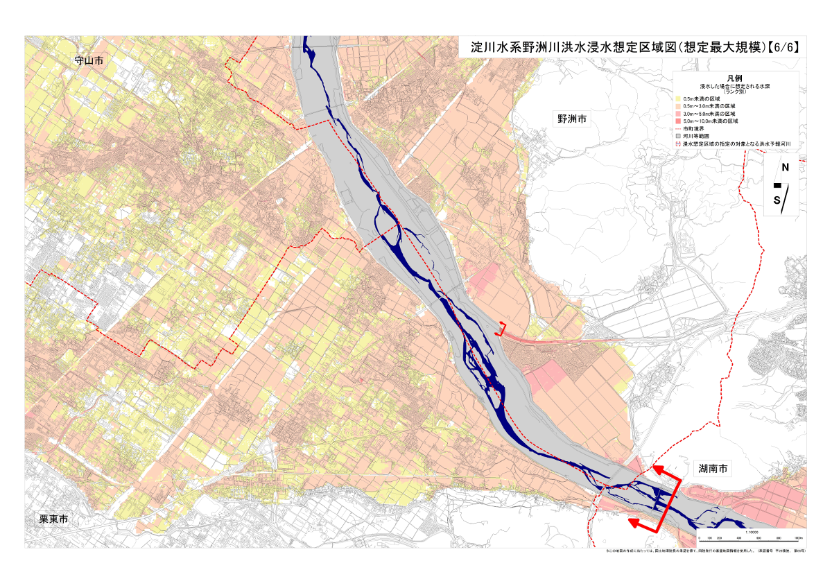 参考情報として、国管理区間より上流で野洲川から越水・溢水させて氾濫させた計算結果も図示していますが、今後、滋賀県が作成する洪水浸水想定区域とは異なる場合があります。