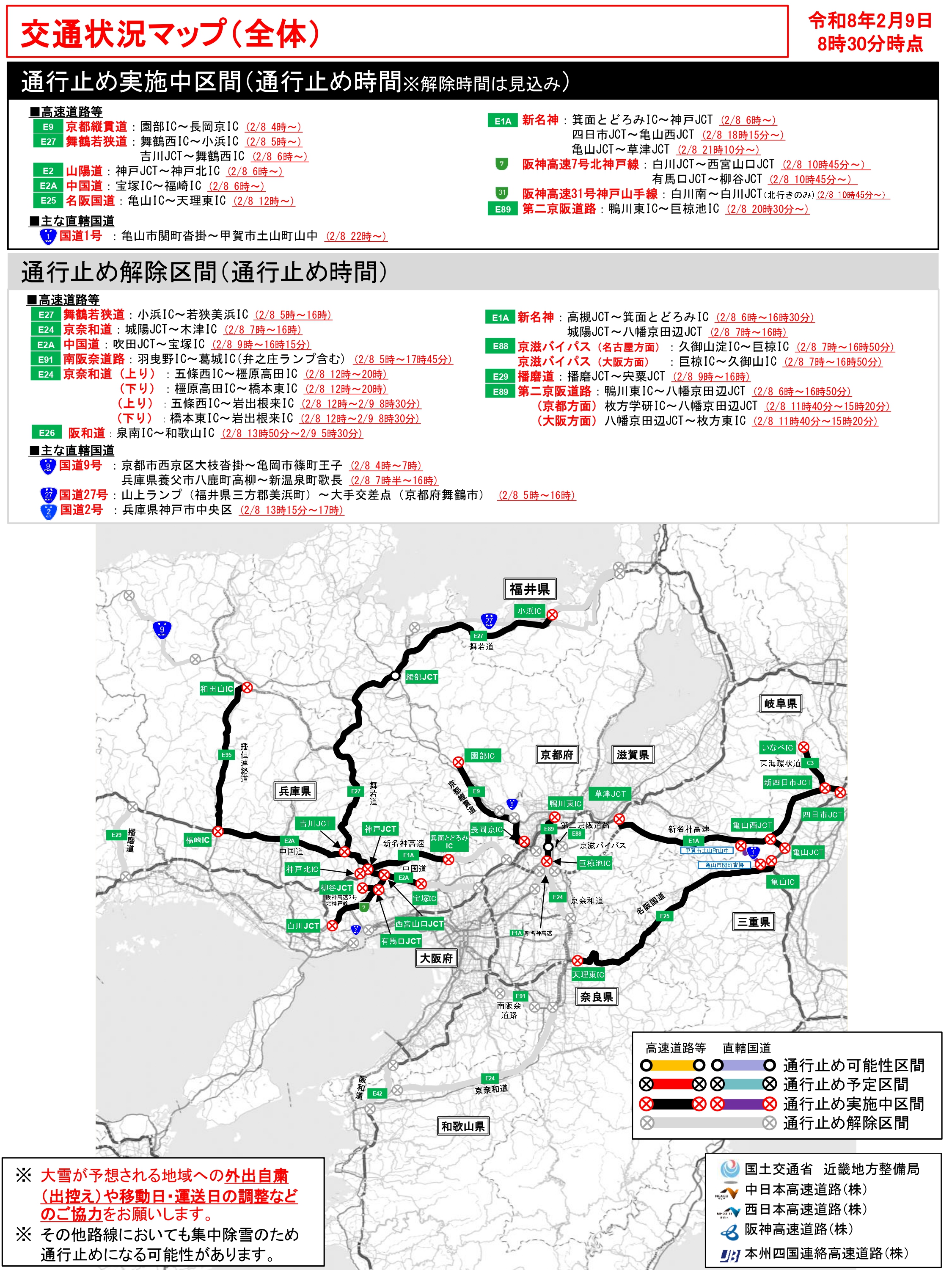 2026年2月9日 大雪の影響による予防的通行止めの実施について ≪2月9日(月)10時現在≫ 2026年2月9日 大雪の影響による通行止めの解除について ≪E24京奈和道の通行止め解除≫ 2026年2月8日 大雪の影響による予防的通行止めの実施について ≪2月8日(日) 22時現在≫ 2026年2月8日 国道9号の通行止め解除のお知らせ(第2報) 2026年2月8日 国道9号の通行止めのお知らせ(第1報) 2026年2月8日 大雪の影響による通行止めの解除について ≪E24京奈和道の通行止め解除≫ 2026年2月8日 国道25号 名阪国道(亀山IC~天理東IC)大雪による通行止めのお知らせ(第1報) 2026年2月8日 大雪の影響による通行止めの開始について≪E24京奈和道の通行止め開始≫