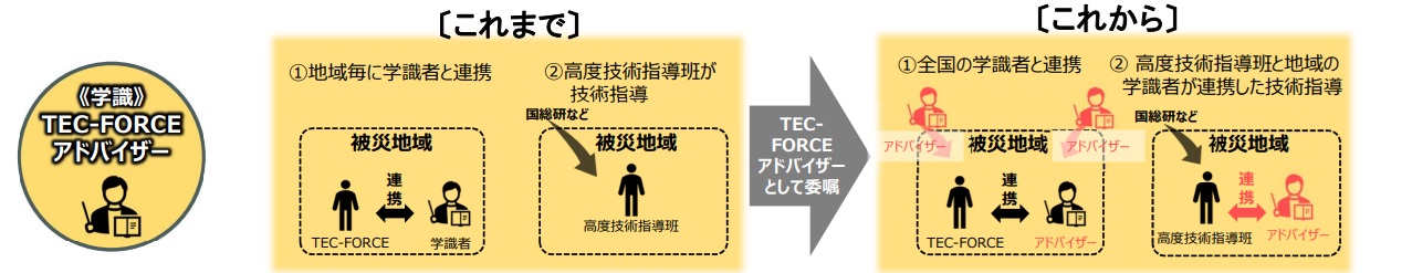被災地で学識者から速やかに技術的助言をいただく新たな枠組み「TEC-FORCEアドバイザー制度」を創設し、事前に委嘱することで技術的判断が難しい事案に即応する体制を確保します。