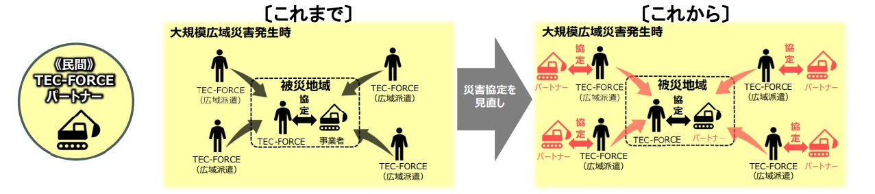 現行の災害協定は必ずしも管外派遣・自治体応援を想定していないため、大規模広域災害における円滑な自治体応援に向け、災害協定を見直し、応援の範囲を支分部局管外・被災自治体応援まで拡大し、国土交通省の要請により活動する企業・団体等をTEC-FORCEパートナーと位置付け、広域的な被災自治体応援においてもTEC-FORCEと一体的な活動を展開します。