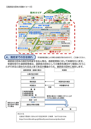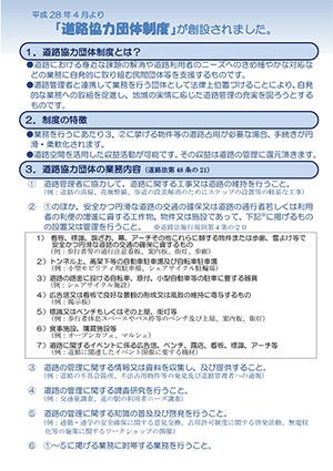 道路協力団体制度とは、道路における身近な課題の解消や道路利用者のニーズへのきめ細やかな対応などの業務に自発的に取り組む民間団体等を支援するものです。