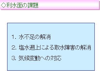 - 塩水の遡上は、臨海工業地帯にとって大きな問題として認識することが必要。さらにその上流の清水町まで農業の被害が出ているということがあった。