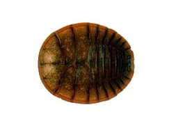 体は固く、平たい円形か卵形で、色は黄色か茶色。足は3対あるが、背の方からは見えない。