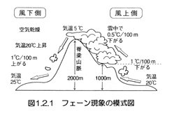 図1.2.1 フェーン現象の模式図 九頭竜川流域の一年間の気候をみると、春先にはしばしば強い南風が吹き、気温が著しく上り、空気が非常に乾燥する日がある。