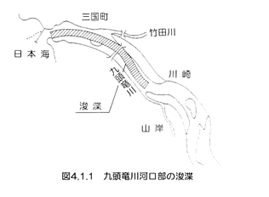 浚渫計画は、三国河口が地勢上河幅の拡張ができないため、浚渫により洪水の疎通を図り、これによって三国港の出入りの船舶の便益を増進することとした。浚渫は図4.1.1に示す法線に従い、敷幅70間(約127m)とし、低水面以下10尺(約3m)の深さに、河口から木部新保地先まで浚渫することとした。