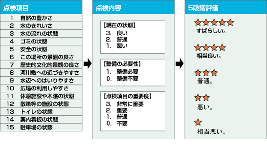 15の点検項目があり、現在の状態、整備の必要性、点検項目の重要度を点検し、最後に5段階評価を行います。