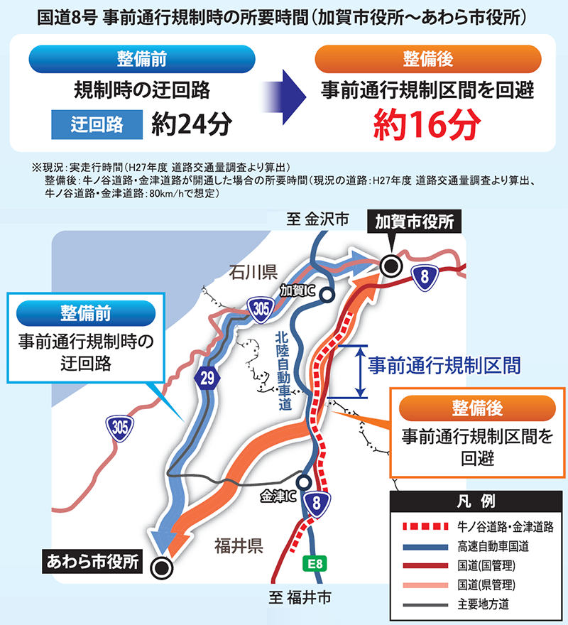 また、北陸自動車道の予防的通行規制時等により、国道8号の交通量が増加した場合にも、安定的な道路交通が確保されます。