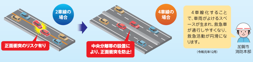 4車線整備されることにより、正面衝突事故の発生リスクが低減し、安全性が向上します。また、2車線道路と比べて緊急車両が走行しやすくなり、円滑な救急搬送が可能となります。