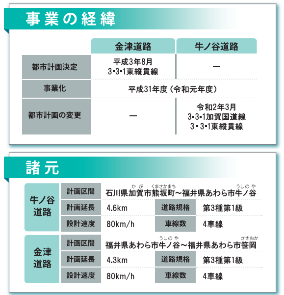 そのため、令和元年度より冬期の交通機能の確保、事前通行規制区間(連続雨量180mm)の回避、災害に強く信頼性の高い道路ネットワークの構築を目的に「牛ノ谷道路(石川県加賀市熊坂町~福井県あわら市牛ノ谷:4.6km)」及び「金津道路(あわら市牛ノ谷~あわら市笹岡:4.3km)」として事業を進めています。