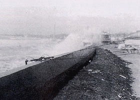 侵食が激しくなり建設省直轄事業として 昭和36年には第2室戸台風、39年には台風20号、そして40年には台風23号と続けて大きな災害が生じました。加えて、風光明媚な海岸として知られた東播海岸も明石海峡の影響などから侵食が激しくなる。そこで、昭和33年に成立した海岸法により、東播海岸の約19kmの区域において建設省(現国土交通省)直轄事業として護岸整備に着手した。 ![]() <昭和39年 20号台風> 狩口地先 ![]() <昭和39年 20号台風>
