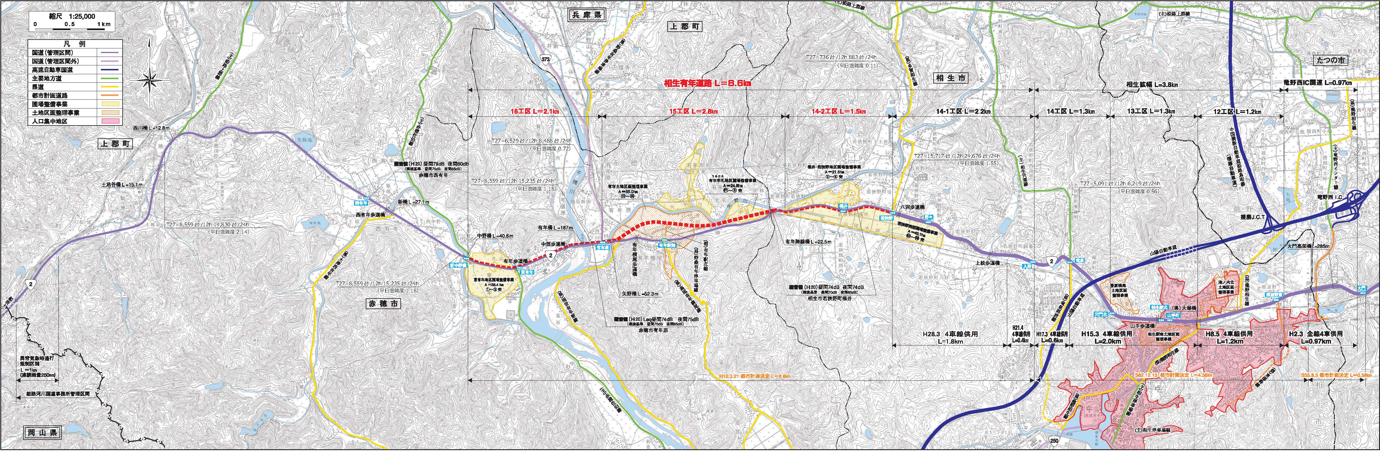 昭和60年度に相生市若狭野町若狭野地先から赤穂市東有年地先の4.9km区間を有年道路として事業化し、 平成12年度には相生市若狭野町鶴亀地先から若狭野地先の3.7kmを含む区間を都市計画変更し、相生有年道路として事業化しました。