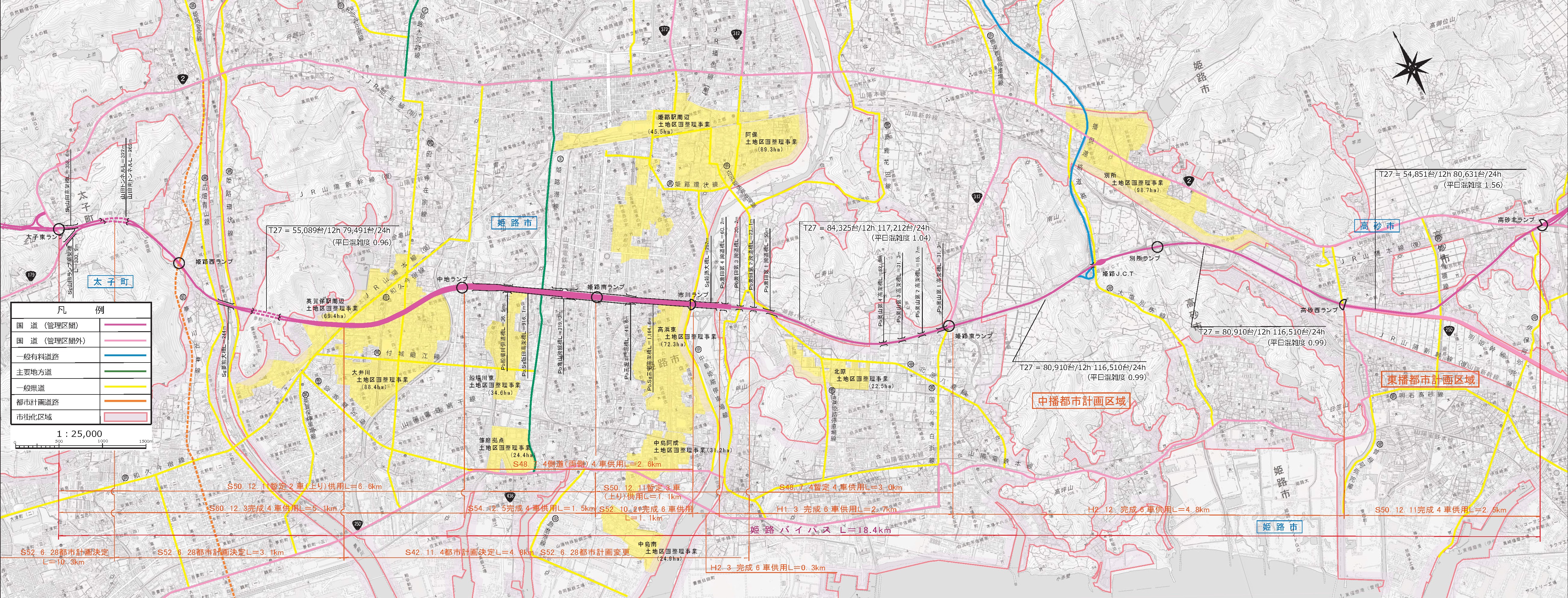 姫路バイパスは、昭和41年度に事業化し、昭和60年12月に全線4車供用、平成2年3月には、高砂西ランプ~姫路南ランプ間の6車供用を行っています。