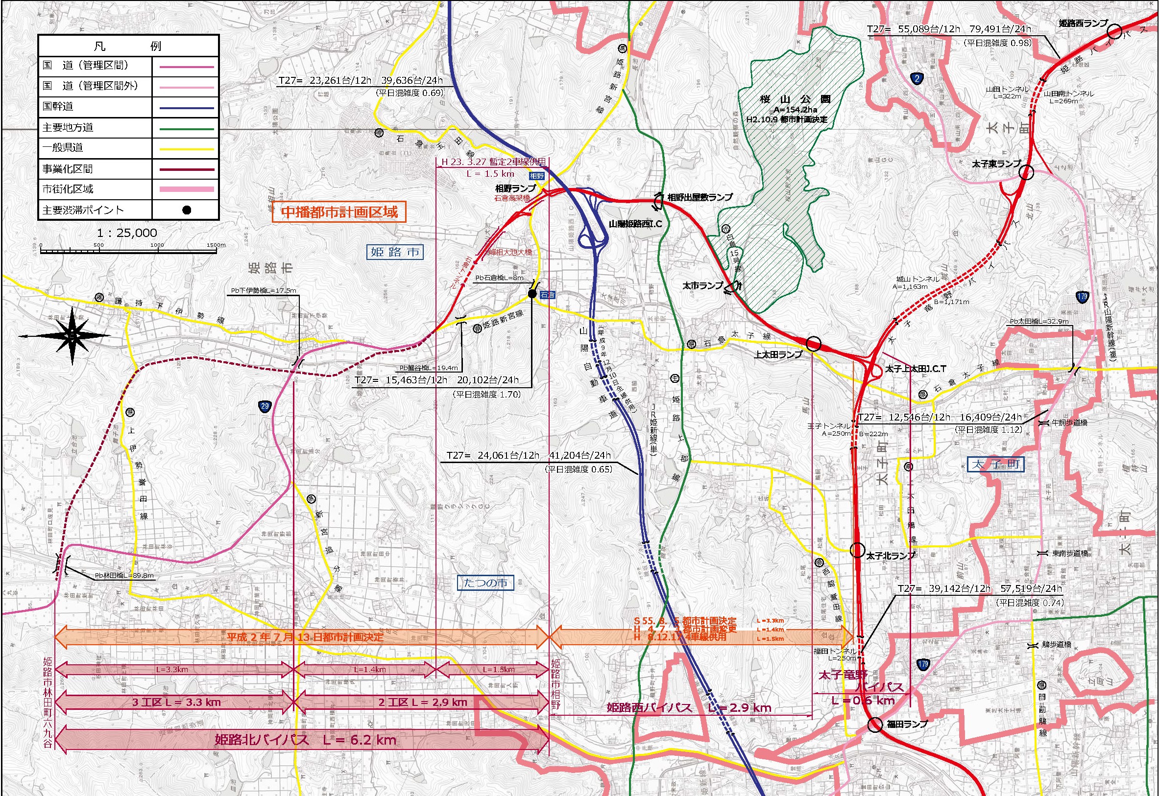 姫路北バイパスは、姫路西バイパス以北の現道の主要渋滞ポイントである石倉交差点等における交通混雑の解消を図るため、 姫路西バイパス終点部(姫路市相野地先)から姫路市林田町六九谷地先に至る約6.2kmのバイパスとして、平成2年度に事業化し、 平成8年度より起点部から用地買収に着手しています。