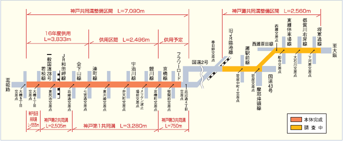 神戸市道(浜手幹線)に計画されている浜手共同溝を通じて2号神戸共同溝と接続し、大阪とのネットワークの構築をめざしています。