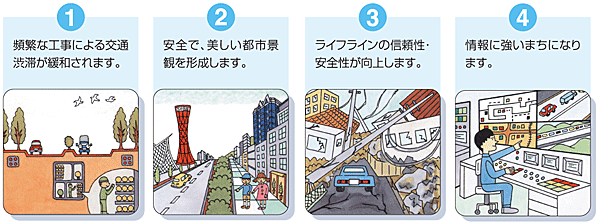 道路には上下水道やガスの管があり、電気、電話などの情報通信ケーブルは電柱や電線が路上に架かっています。そこで、都市機能に重要な基幹インフラの管や線を地下に収容するために埋設した施設が「共同溝」です。空間を有効利用しライフラインをネットワーク化、路上工事を削減し、都市の景観や安全性を向上します。
