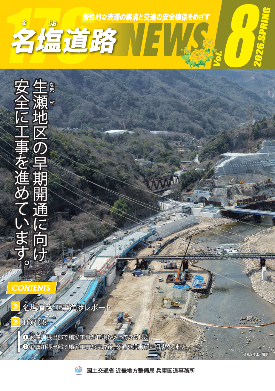西宮市から宝塚市間の国道176号は歩道が未整備で異常気象時通行規制区間を有しながら、発展の著しい阪神北部地域と阪神都市圏を結ぶ役割を担っています。名塩道路は幹線道路としての機能向上、安全確保を図るとともに、救急・救助活動の搬路として利用できる災害に強い道路を目指し整備を進めています。