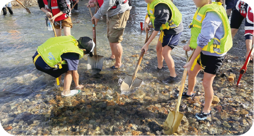アユの産卵場づくり 猪名川・藻川は水質改善により、アユが見られるほどきれいになりました。 もっとたくさんのアユが住む川にする環境づくり体験をしてみませんか? ツルハシやスコップで川底を整えて、アユを迎える準備をしよう!
