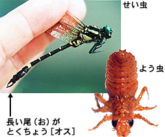 日本でもっとも大きいトンボ。体長は、オスは85〜90mm、メスは110mm。複眼(ふくがん)は、エメラルドのような光たくの強い深緑色をしています。よう虫は、体長40〜46mmで、頭部は長方形で、複眼(ふくがん)が前側方(ぜんそくほう)につき出しています。水ぞこの、すなやドロがまじるところや、落ち葉などの下にすんでいます。