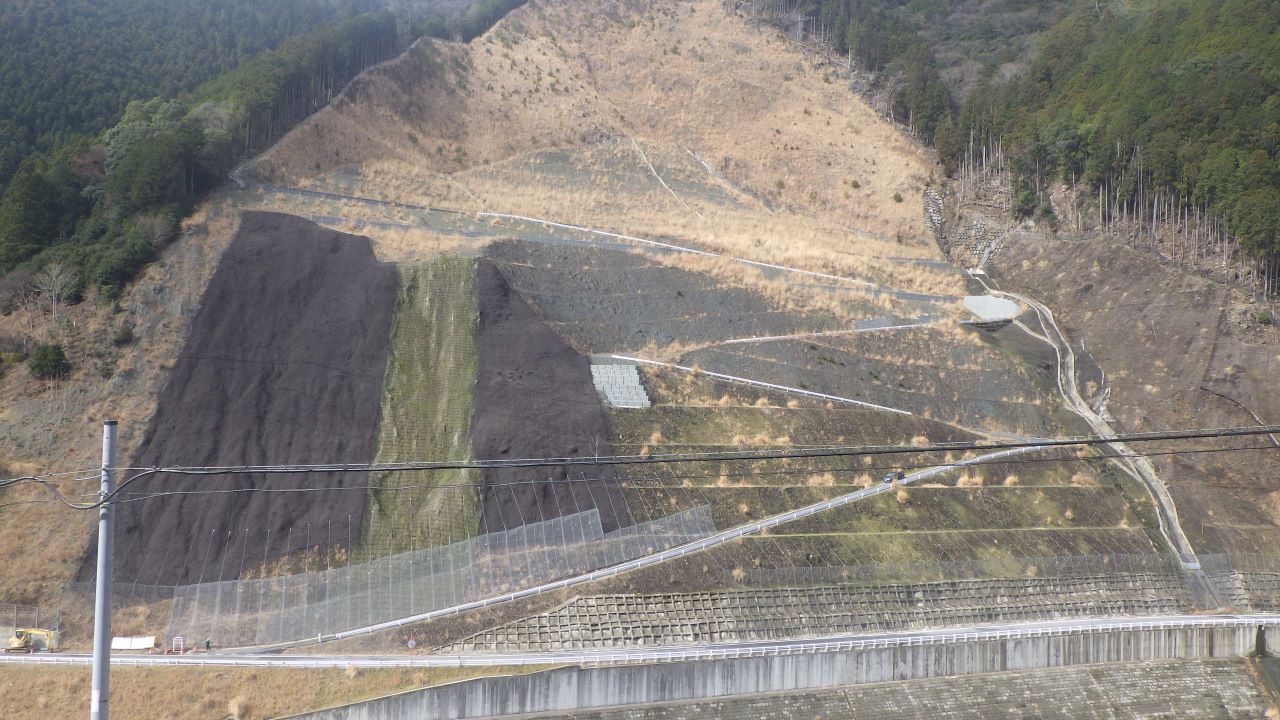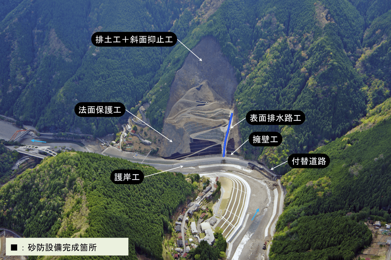 清水地区では発災当時、幅220m、高さ250m、長さ350mの崩壊が発生し約160万m3にのぼる崩壊土砂が発生しました。緊急対策工事により崩壊斜面の安定化のための整備および洪水流の安全な流下のための護岸整備が完了し、令和7年3月管理を奈良県に移管しました。