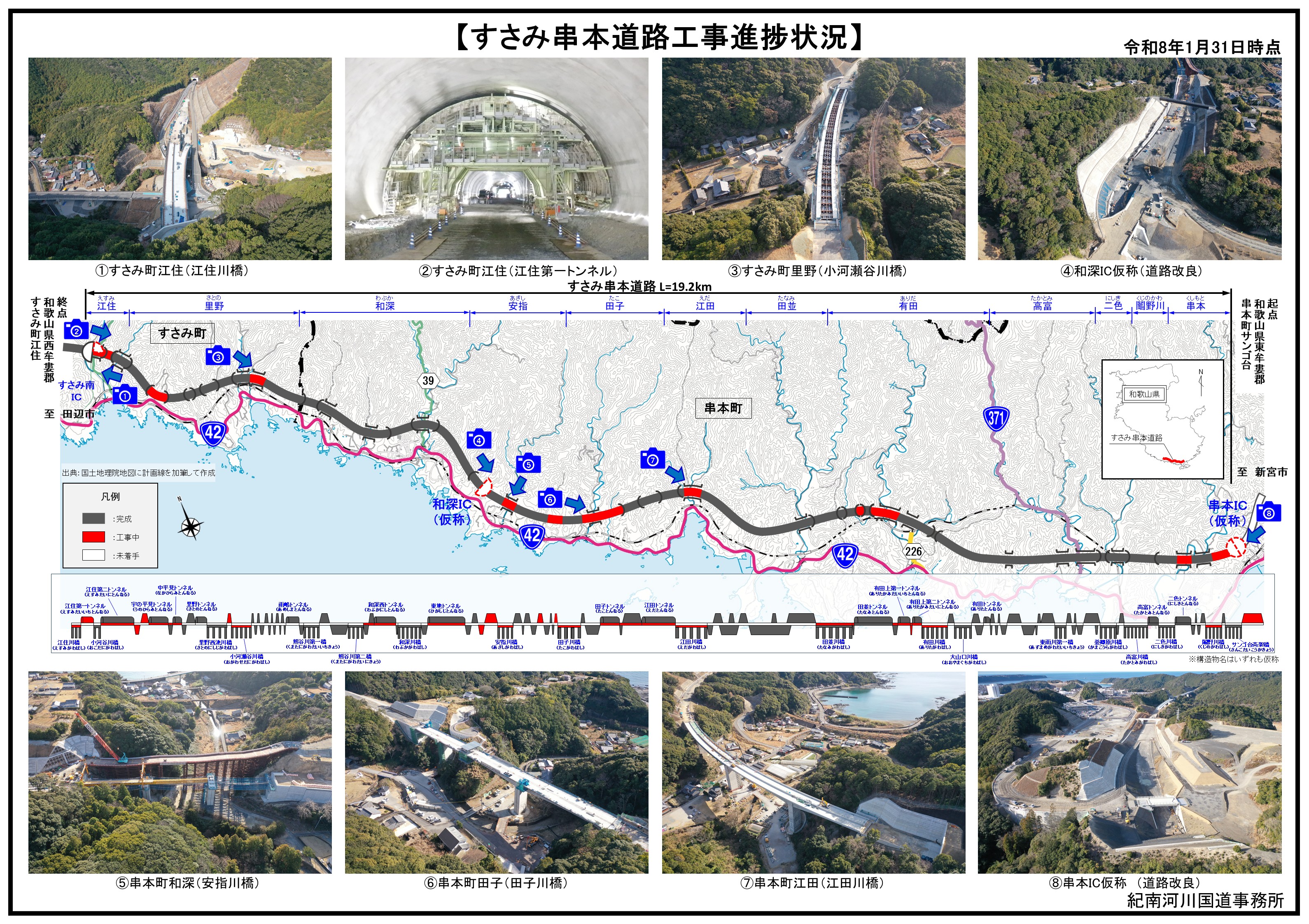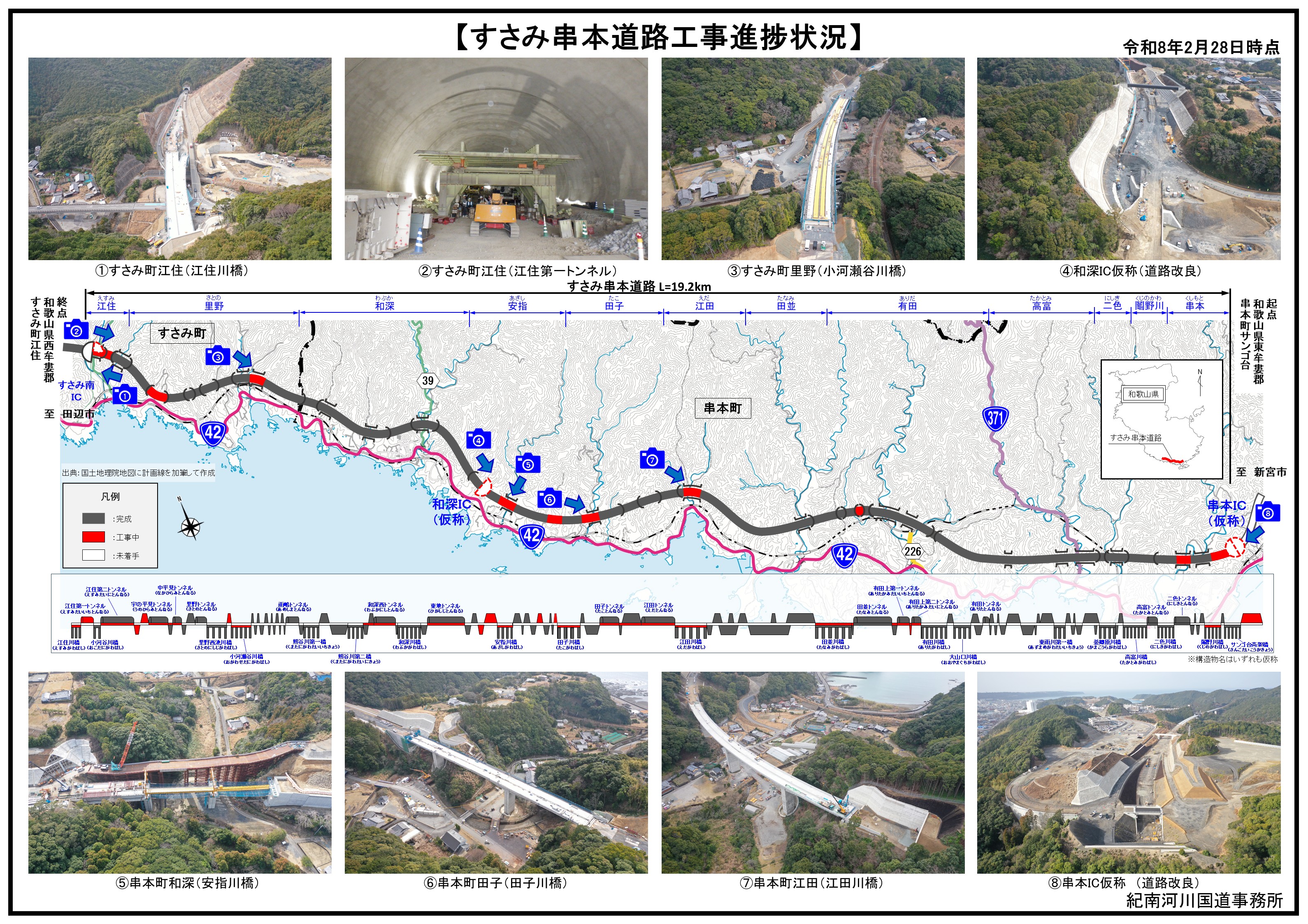 すさみ串本道路は、国道42号の和歌山県東牟婁郡串本町から西牟婁郡すさみ町間における、異常気象時通行規制区間の解消、防災・災害時の代替路確保等を主な目的としています。