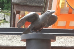 神武天皇が熊野から大和に入られた時に道案内をしたのが三本足のカラス「八咫烏(やたがらす)」だったと伝えられ、熊野権現では神鳥として崇めています。一月二日から八日まで烏文字で書いた有名な牛王(ごおう)神符を印刷する牛王神璽(しんじ)祭が行われます。また、境内には八咫烏の青銅の像が、そして中庭に烏石があります。神武天皇をお導きして大和に赴き、その大任を終えて帰ってきた時、この石のところで姿を消して烏石に化したと言い伝えられています。烏が羽を休めて首を羽にうずめている姿に見える石です。この八咫烏は、全日本サッカー協会のロゴマークとして、全国的に有名になりました。(2006.11.23)