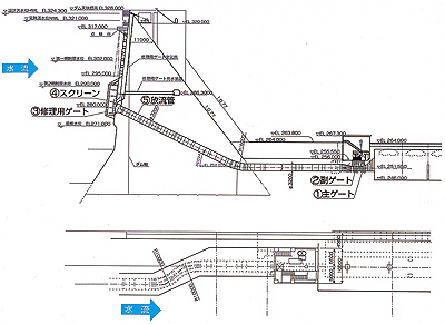 修理用ゲートは、流水遮断機能を期待してローラゲートを採用するのが常です。大滝ダム計画水位維持放流設備においては、水圧バランス状態でしか操作しないことを前提に、高圧スライドゲートの採用が可能になり、コスト縮減に貢献しています。