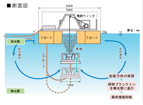 連続的な気泡発生により施設周辺の水を鉛直方向に循環させ、表面に集積した植物プランクトンを光の届かない深い層まで連行し植物プランクトンの異常増殖を抑制します。