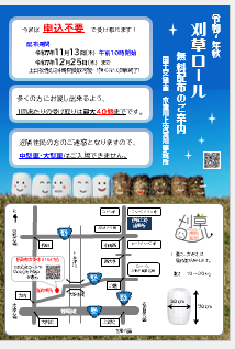 - □ 近年の資材・労務費の高騰により刈草ロールの製作費が増加していることから、無料配布の方法を検討しており、来年度以降の配布については、現時点で未定です。