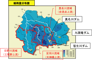 真名川ダム、笹生川ダムの洪水調節により、五条方地点で約2.2mの水位低減効果がありました。