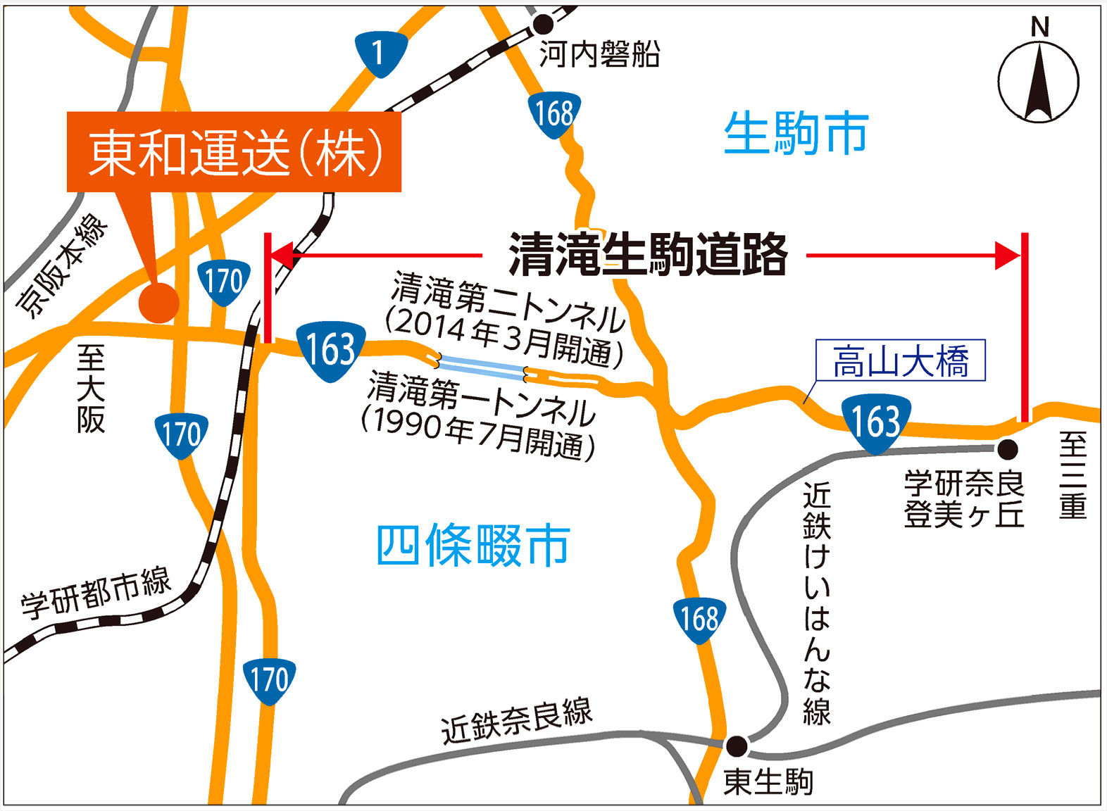 東和運送(株)門真支店は1997年に設立され、主として関東及び九州の幹線便と近中距離輸送を運行しています。2009年に四條畷市へ移転してからも、大阪から三重などを結ぶ輸送には国道163号を利用してきました。