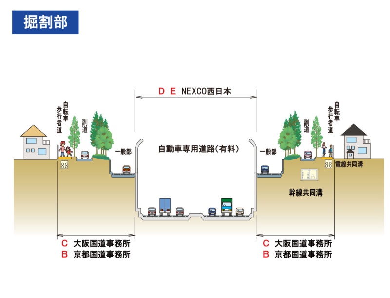 第二京阪道路 一般道路の大阪北道路(大阪府域)については大阪国道事務所、京都南道路・洛南道路(京都府域)については京都国道事務所が管理をしています。