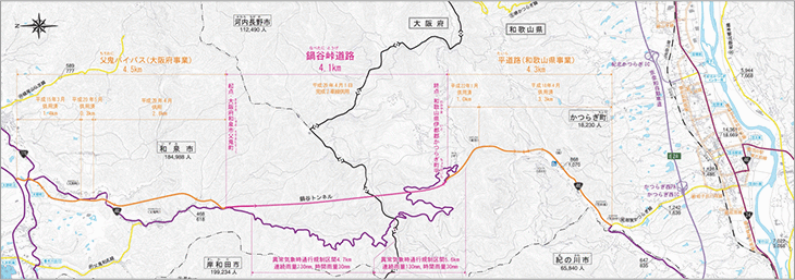 府県境をまたぐ延長4.1kmの区間は、地形条件が厳しく、整備に高度な技術を要することから、平成20年度より直轄権限代行事業として、両府県に代わり国土交通省で事業を実施し、平成29年4月1日に和泉市父鬼町~かつらぎ町平間が完成2車線開通し、接続する父鬼バイパスも全線開通しました。