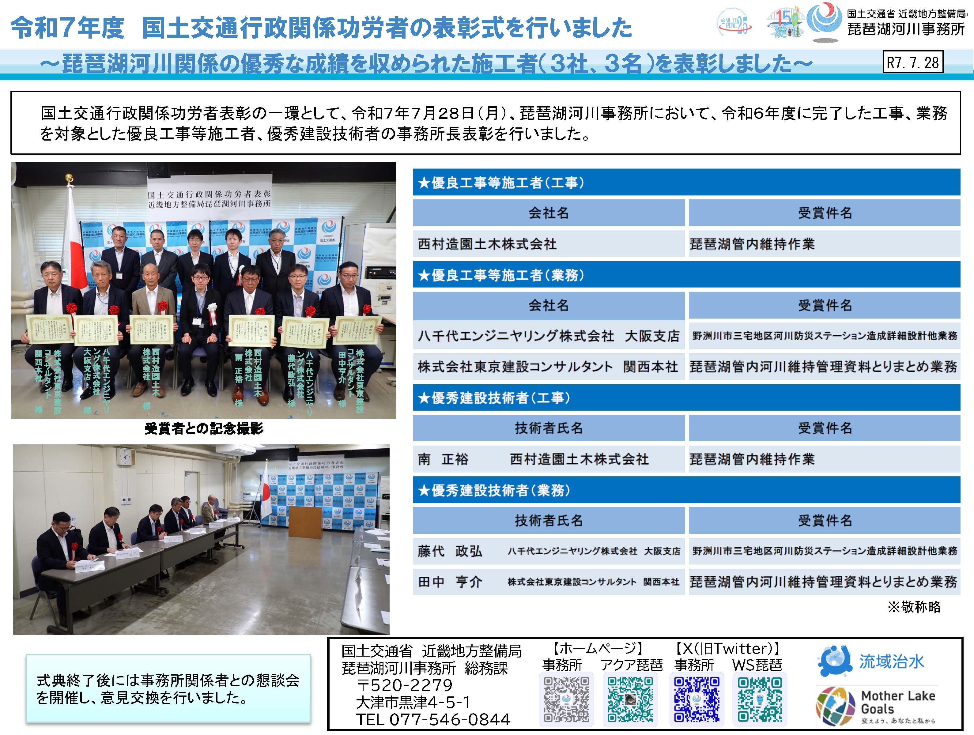 ~琵琶湖河川関係の優秀な成績を収められた施工者(3社、3名)を表彰しました~