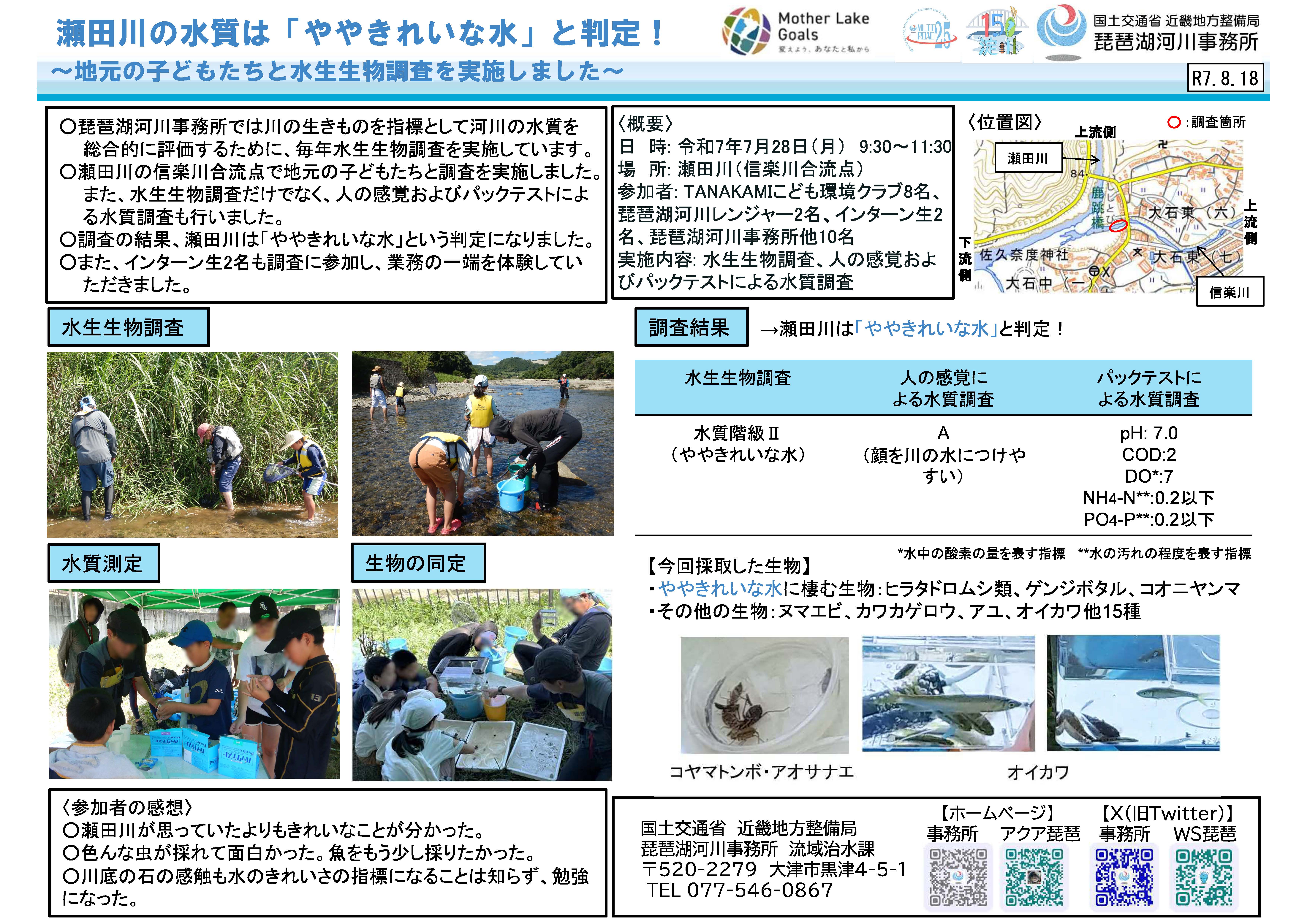 【琵琶湖河川事務所】瀬田川の水質は「ややきれいな水」と判定!~地元の子どもたちと水生生物調査を実施しました~