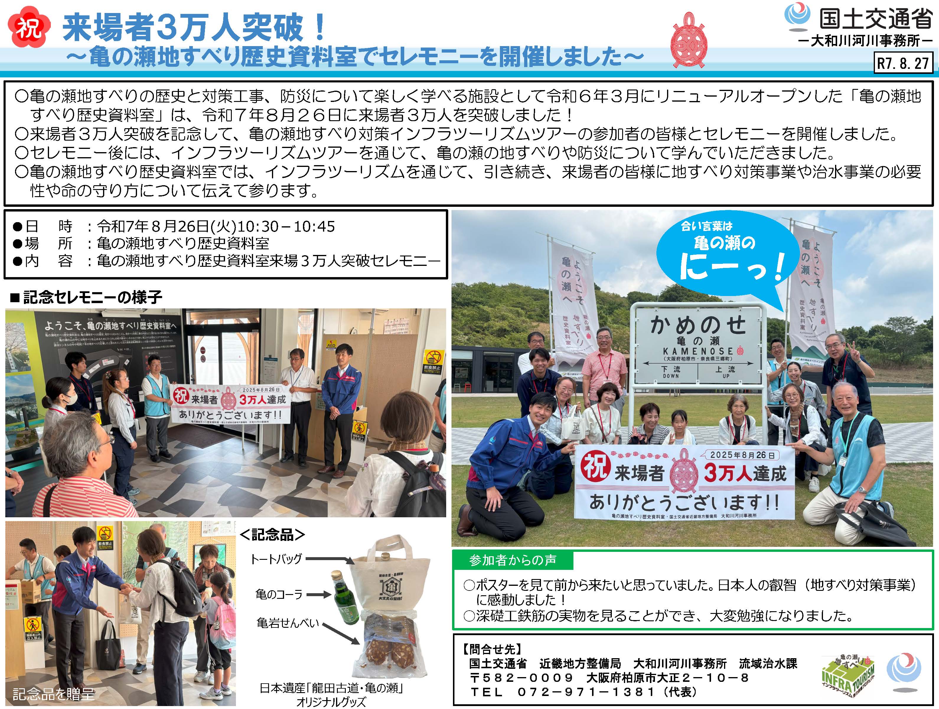 【大和川河川事務所】来場者3万人突破!~亀の瀬地すべり歴史資料室でセレモニーを開催しました~