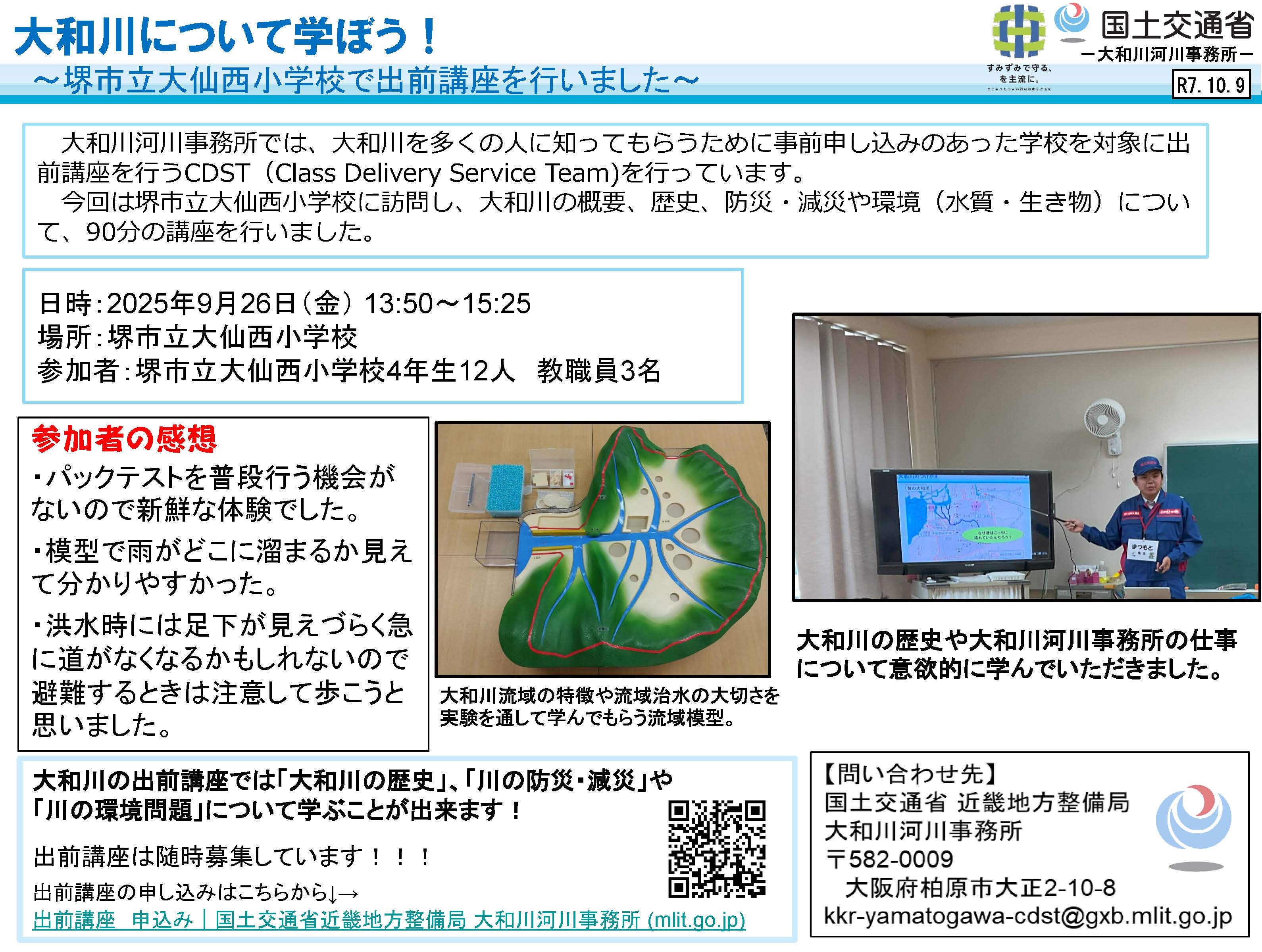 【大和川河川事務所】大和川について学ぼう!~堺市立大仙西小学校にて出前講座を行いました~