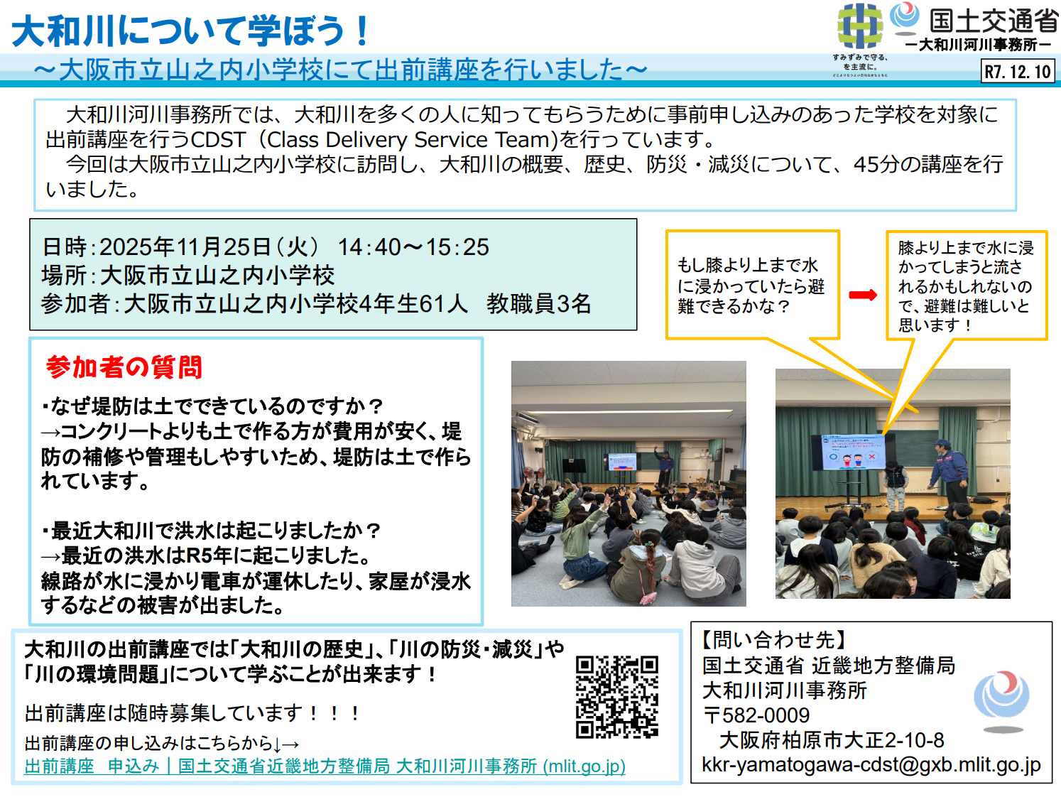 【大和川河川事務所】大和川について学ぼう!~大阪市立山之内小学校にて出前講座を行いました~