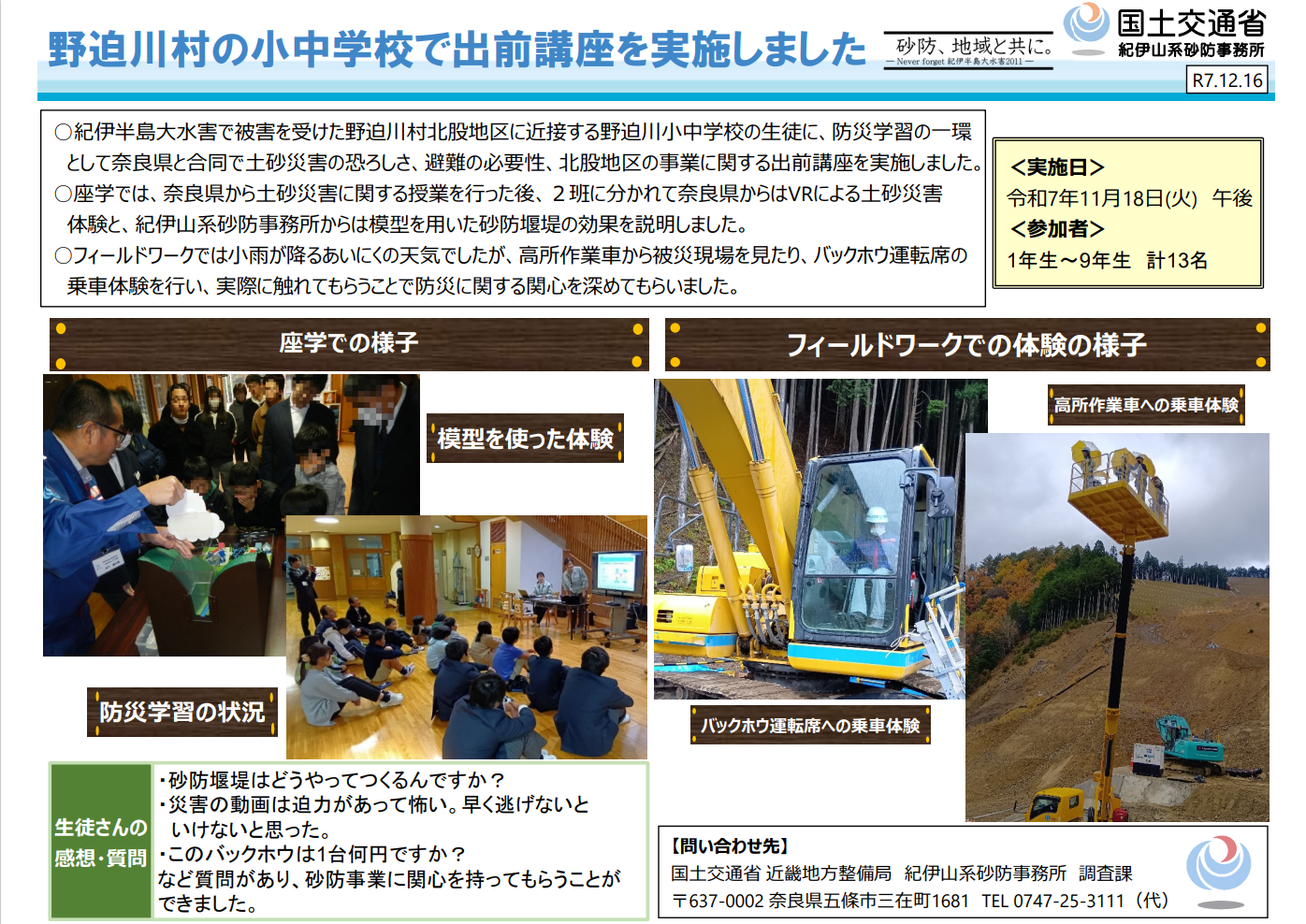 【紀伊山系砂防事務所】 野迫川村の小中学校で出前講座を実施しました