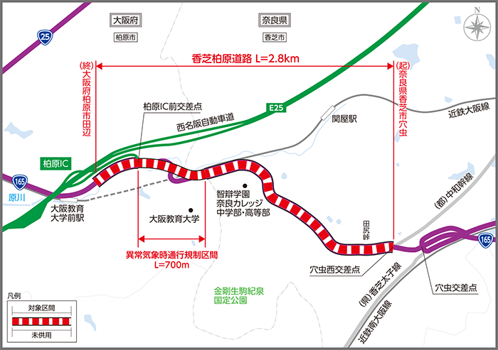 また、奈良・大阪府県境付近の異常気象時通行規制区間の解消や自転車歩行者道の設置により、安全な道路へ