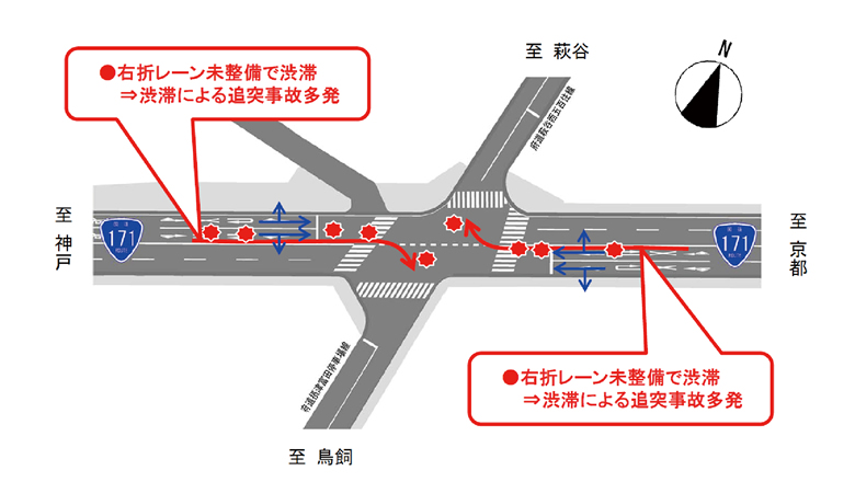 大畑町交差点は、国道171号と、府道が交差する大規模な交差点で、右折レーンが未整備のために交通が渋滞し、急な車線変更を誘発することによって、接触や追突の事故が発生していますので、右折レーンの新設を実施しました。