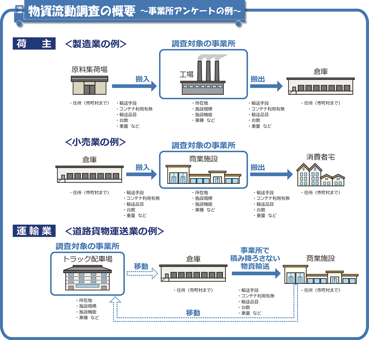 近畿圏の物流交通の実態を総合的に把握するため、都市圏の物の動きについて、事業所属性、物資の品目、発着施設、輸送手段、中継の場所等について多面的に捉え、総合的な都市交通計画の基礎資料とするものです。