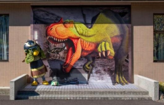 | 施設の外壁では、恐竜のトリックアートが迎えてくれます。 | |||||||||