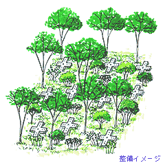 植生管理:樹林の効果を保つことができるよう、植生の維持管理を実施します。(植物の成長、遷移を助けるため、除伐、ササの駆除等)