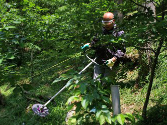 ![]() ササが多いエリアは刈払機を活用 |
