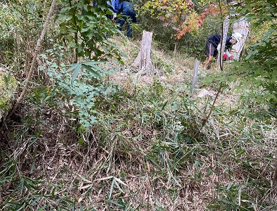 前回に引き続き、手刈りで下草刈りを行いましたが、秋ということもあり下草の成長は控えめでした。北側部分を中心に作業を行い、少しずつですが手入れできた区域が広がってきました。