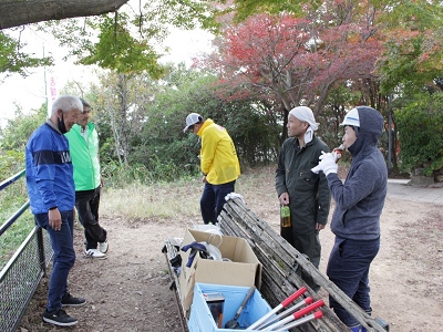 植樹予定場所は、ネザサやニセアカシアが繁茂していましたが、丁寧に刈り取っていき10本の苗木を植える場所を整地しました。また、植樹会へ参加される方が、神戸の街の眺望を楽しめるよう、斜面の草刈りも行いました。