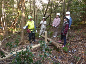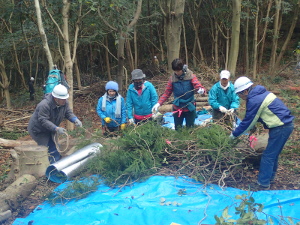 午前は3班に分かれて熟練者の指導の下、真剣かつ和気あいあいと常緑樹の伐採やリースの材料を集めました。フェイスブック用の写真撮影に協力いただいた昼食の後は「まだ木を伐りたい!」と希望する伐採班とリースづくりの班に分かれそれぞれの活動を楽しみました。