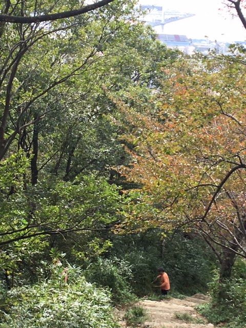 秋晴れの下、来春1月26日(土)開催「第4回ヤマザクラ一斉植樹会」の準備作業として、予定エリアの登山道沿いでの補植を含めた植樹ポイントの選定とその下草刈りを3人で行いました。