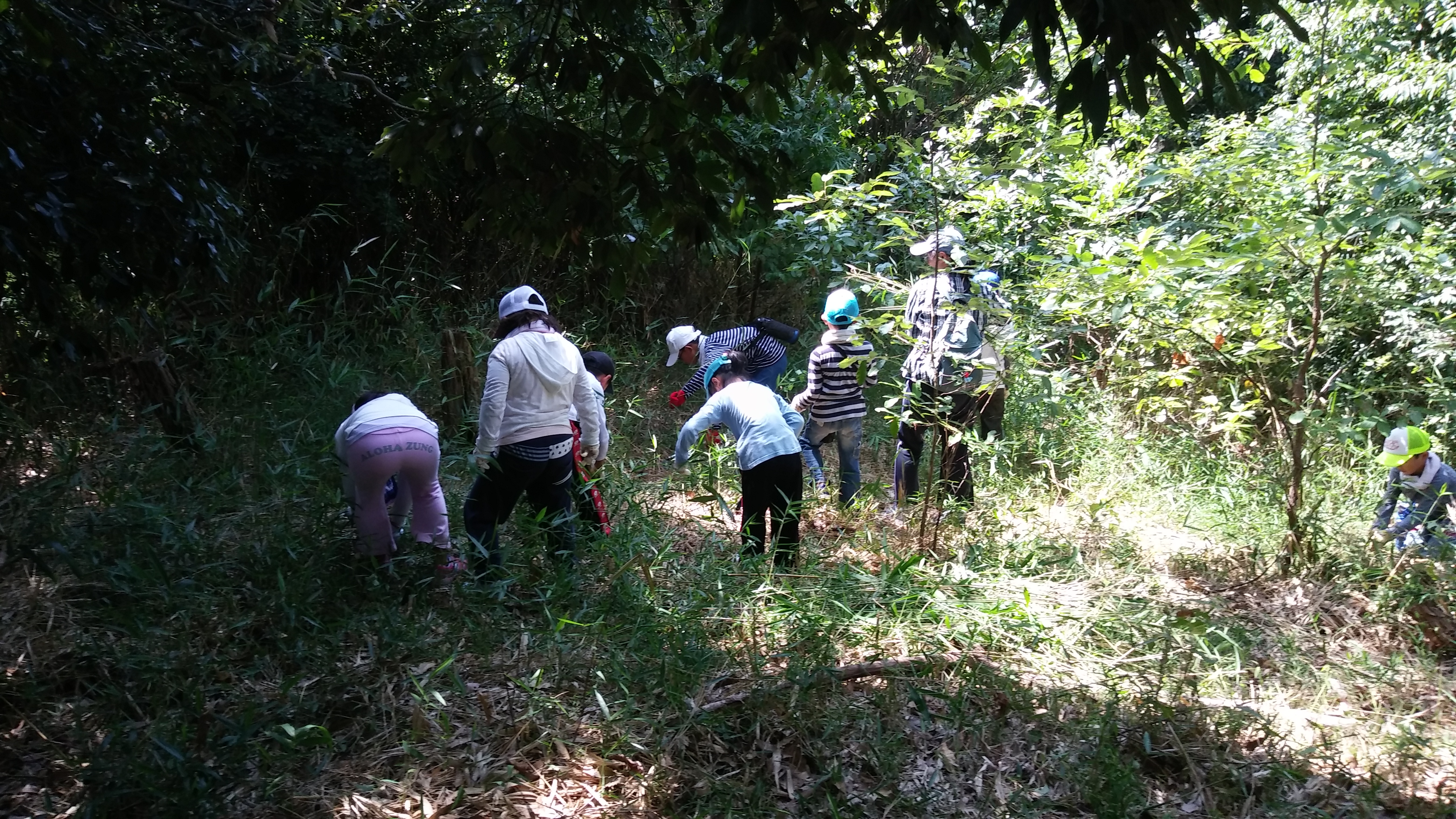 今までの里山活動の説明をした後、どんぐり拾いの場所で鎌を使い草刈りをしました。その後は、初めての試みの「そうめん流し」。子供も大人も歓声をあげながら満腹になった夏の一日でした。